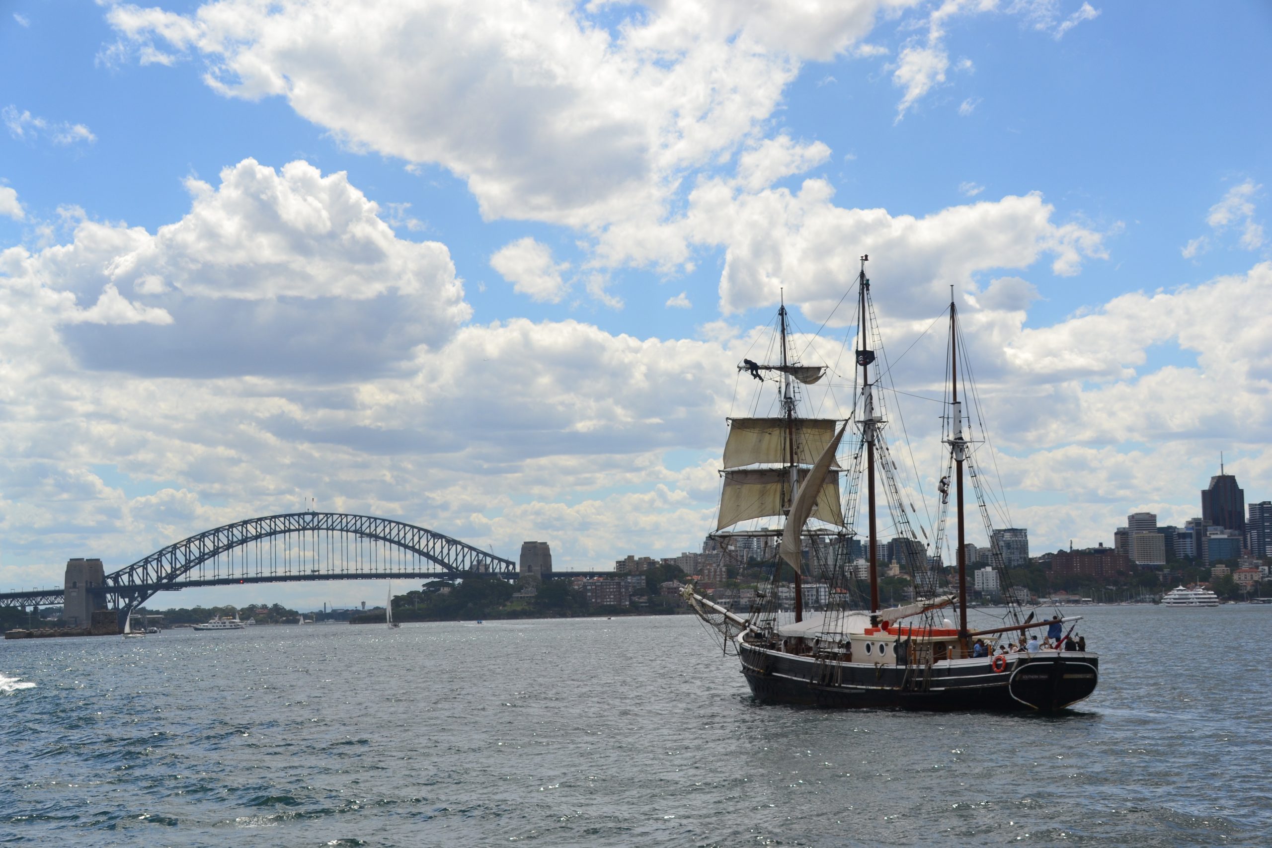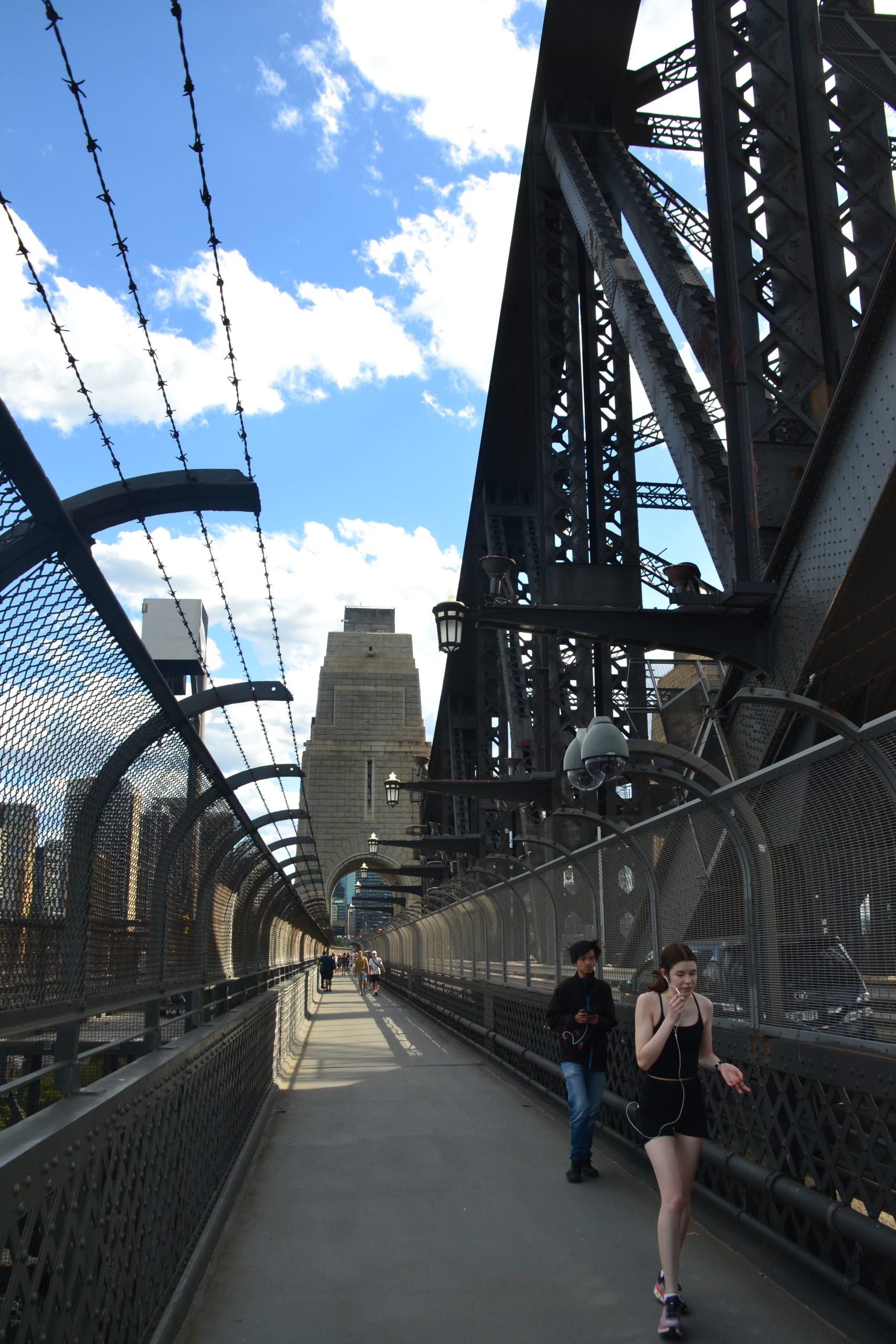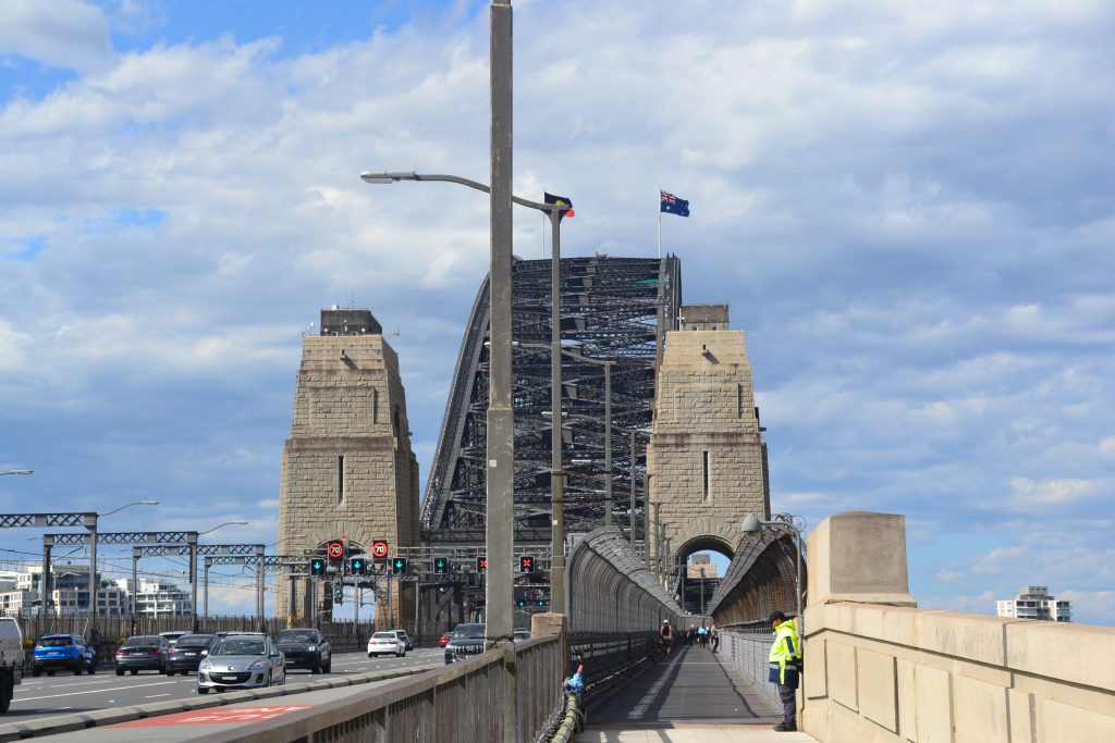 Dann wird zu Fuß über die Harbour Bridge marschiert. Nicht komplett, nur knapp bis zur Hälfte. Denn von dort kann man die Oper gut fotografieren. Und wir sind uns nicht sicher, ob wir die Oper schon fotografiert haben. Auf der Brücke weht ein kleiner Orkan. ICBeter setzt nicht nur den Hut ab, sondern sicherheitshalber auch die Brille, damit sie nicht davon fliegt. Immerhin kann man auf der Brücke weit genug wandern, dass die Celebrity Edge die Oper nicht mehr verdeckt.