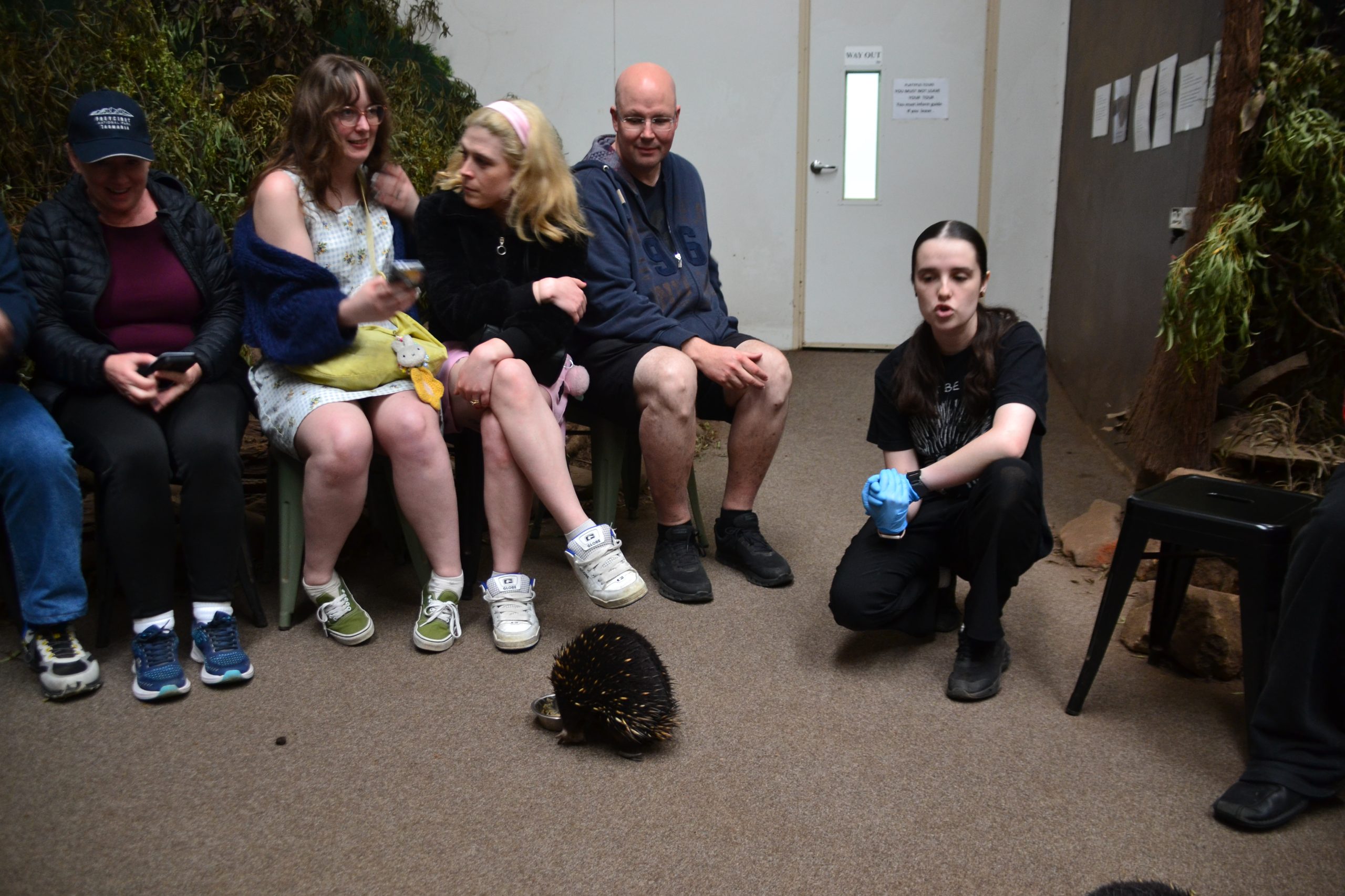 Dann geht es zu den Ameisenigeln. Die sind nicht giftig, sondern freundliche Zeitgenossen. Man kann in ihr Terrarium hineingehen und sich hinsetzen. Die laufen einem dann rund um die Füße herum. Es sind genug Hocker für alle da, deshalb muss nicht die Reise nach Jerusalem gespielt werden. Das wäre auch eine viel zu weite Reise gewesen. Auch diese Viecher werden gefüttert, damit sie in die Mitte der Leute kommen und angeschaut werden können.