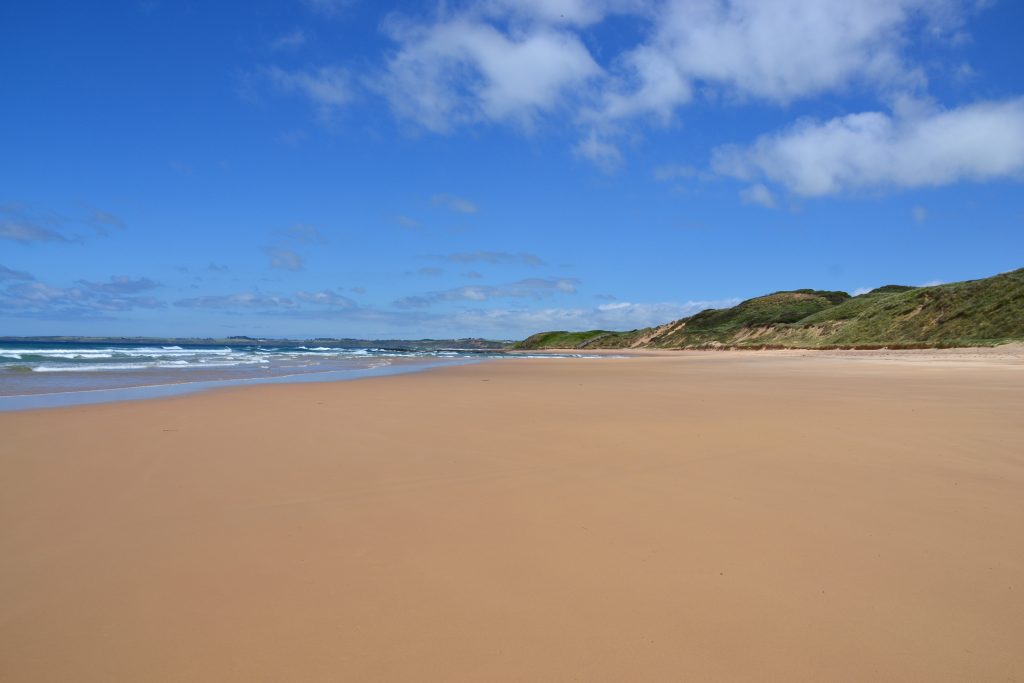 Er liegt zwischen einem Fluss und dem Meer. Die Temperatur des Meerwassers hat aber auch hier noch Luft nach oben. Schwimmen ist nur was für Eisbade-Freaks. Während der Wanderung am Strand ziehen in der Ferne plötzlich sehr dunkle Wolken auf. Da heißt es zurück zum Wohnmobil. Als wir drin sind, schüttet es wieder wie aus Schaffeln. Glück gehabt.