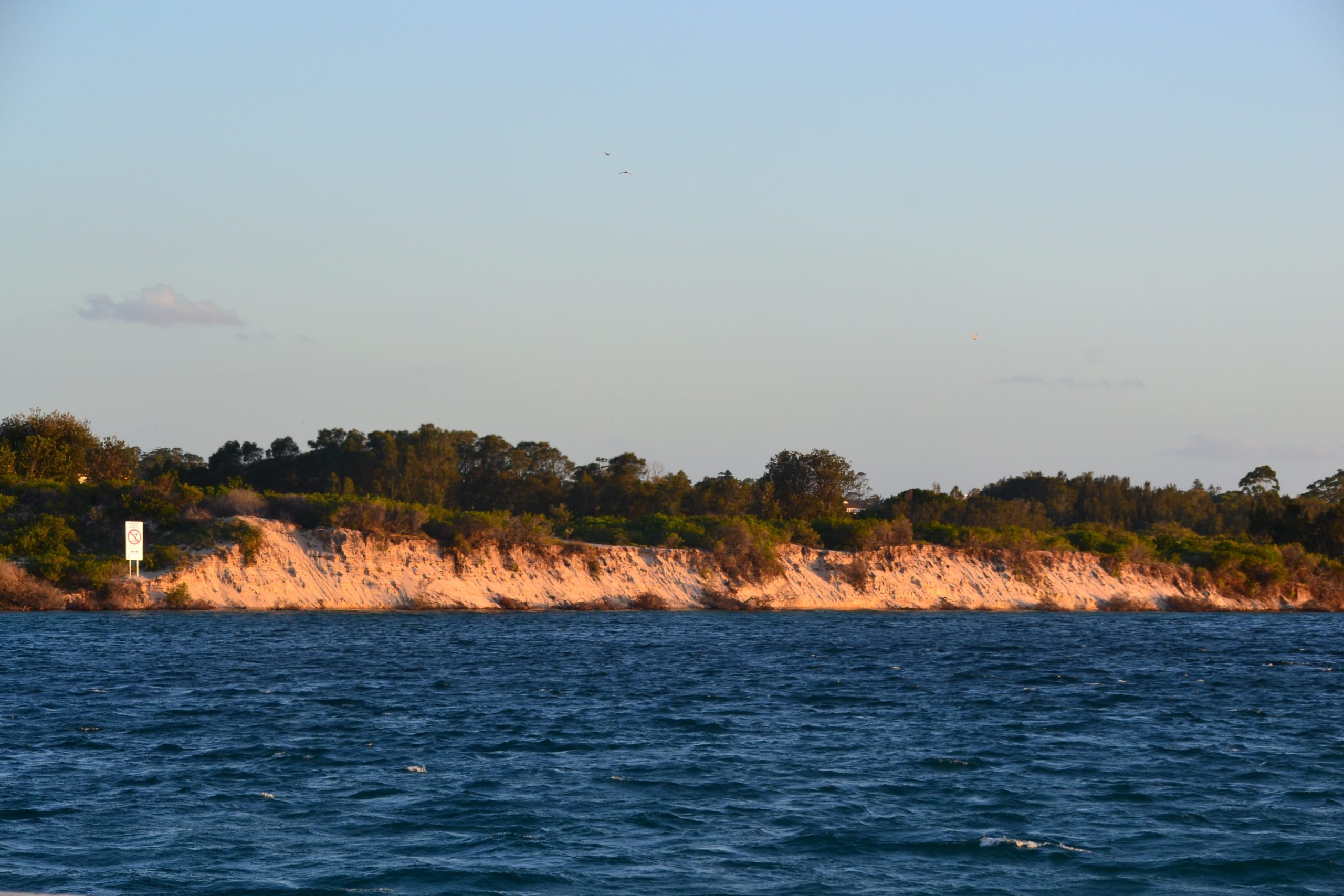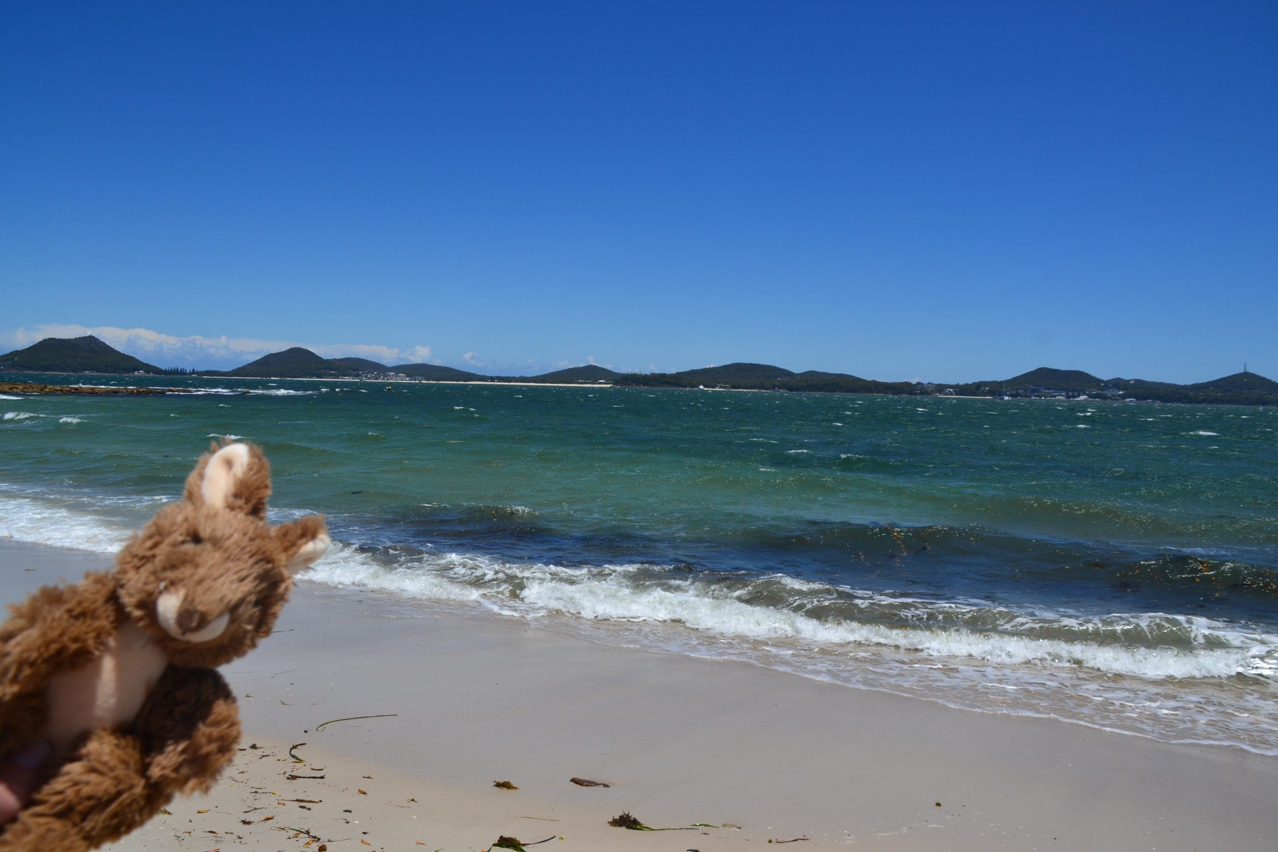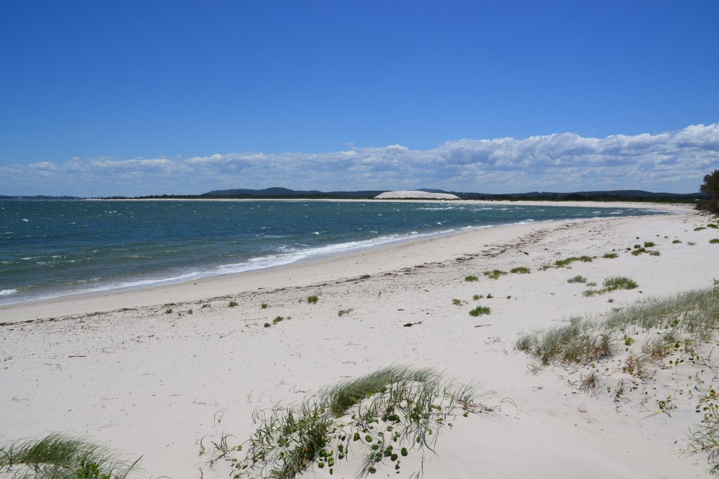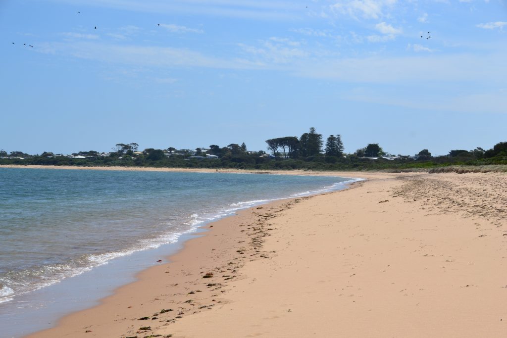 Sie geht zuerst durch einen kleinen Wald. Am Anfang steht ein Schild, dass man Sichtungen von Koalas melden soll. Das machen wir natürlich. Oder würden es machen, wenn sich die Koalas nicht verstecken würden. Dann geht es entlang des Sees dem Sandstrand entlang. Dort zeigt sich auch allerhand Geflügel. Der Wind geht wieder mal ordentlich.