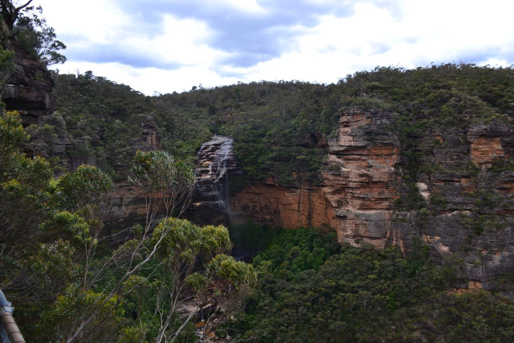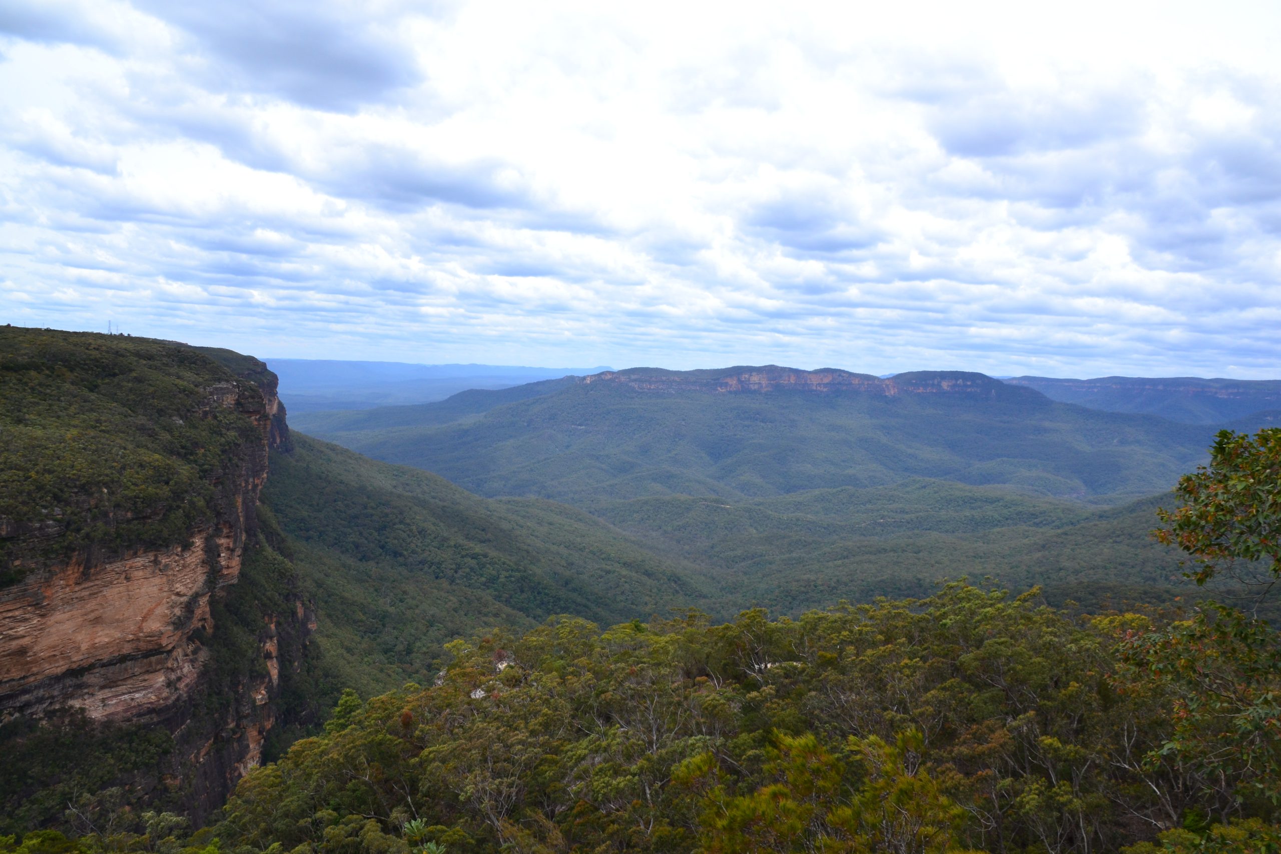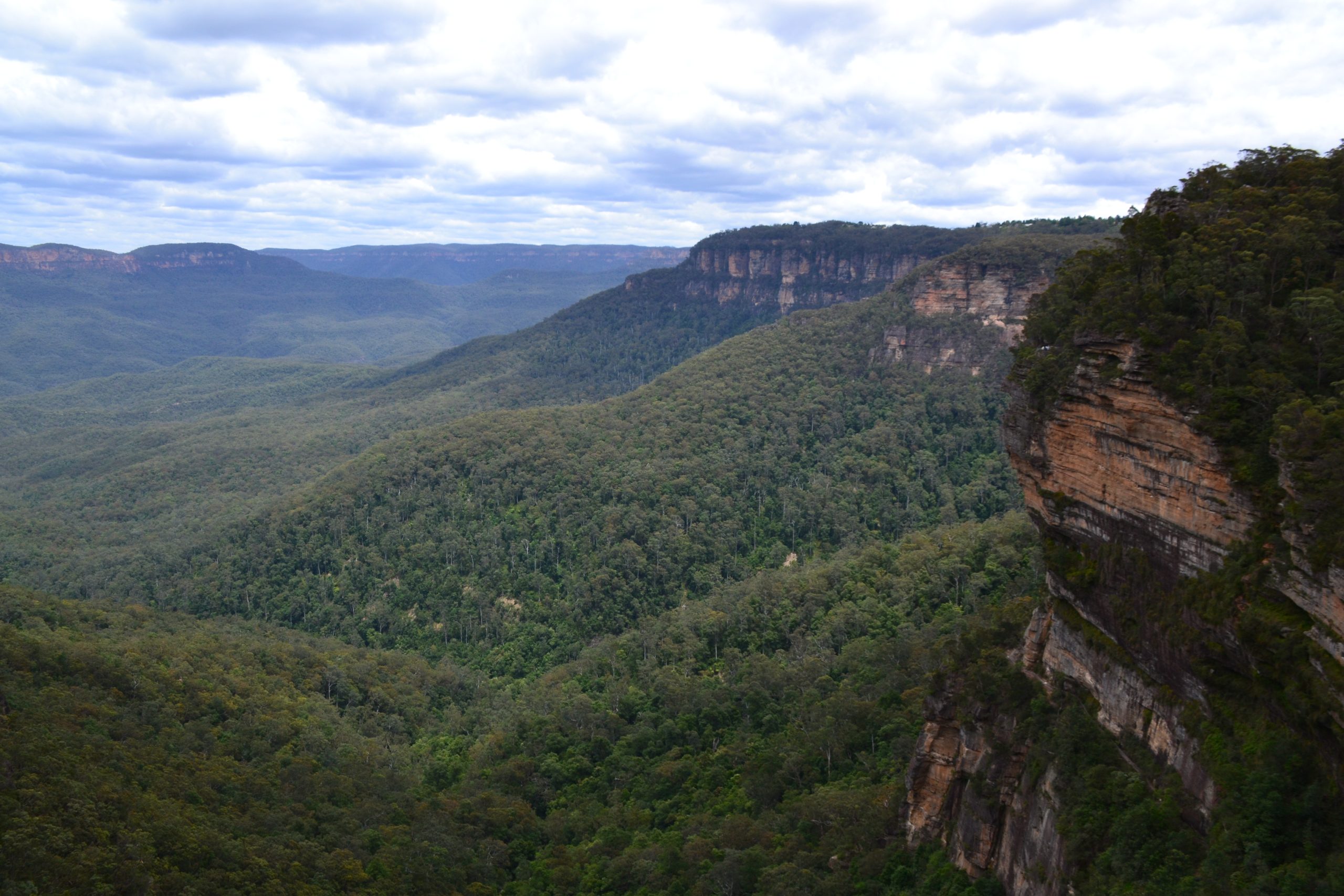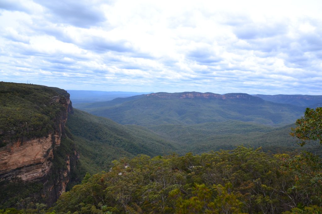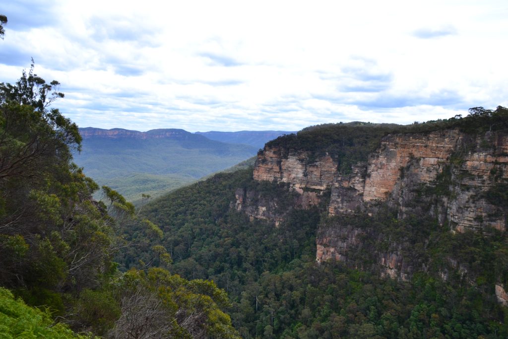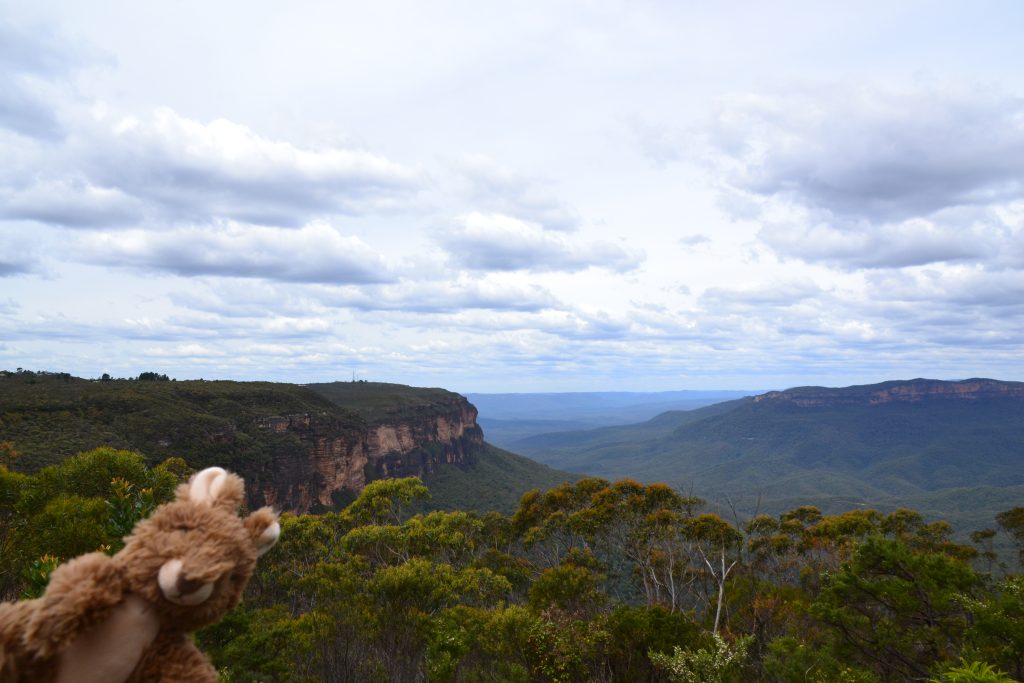 Natürlich ist eine Wanderung geplant. Der Overcliff-Undercliff Trail. Bis zum dritten Lookout gehen sogar alle mit. Es wird aber nicht verraten, wer beim dritten umdreht. Der Weg heißt so, weil es ein Rundweg ist, der in eine Richtung oberhalb und in die andere Richtung unterhalb der Felsen geht. Meist ist man im Wald, immer wieder gibt es aber Lookouts, wo man einen weiten Überblick über die Blue Mountains hat.