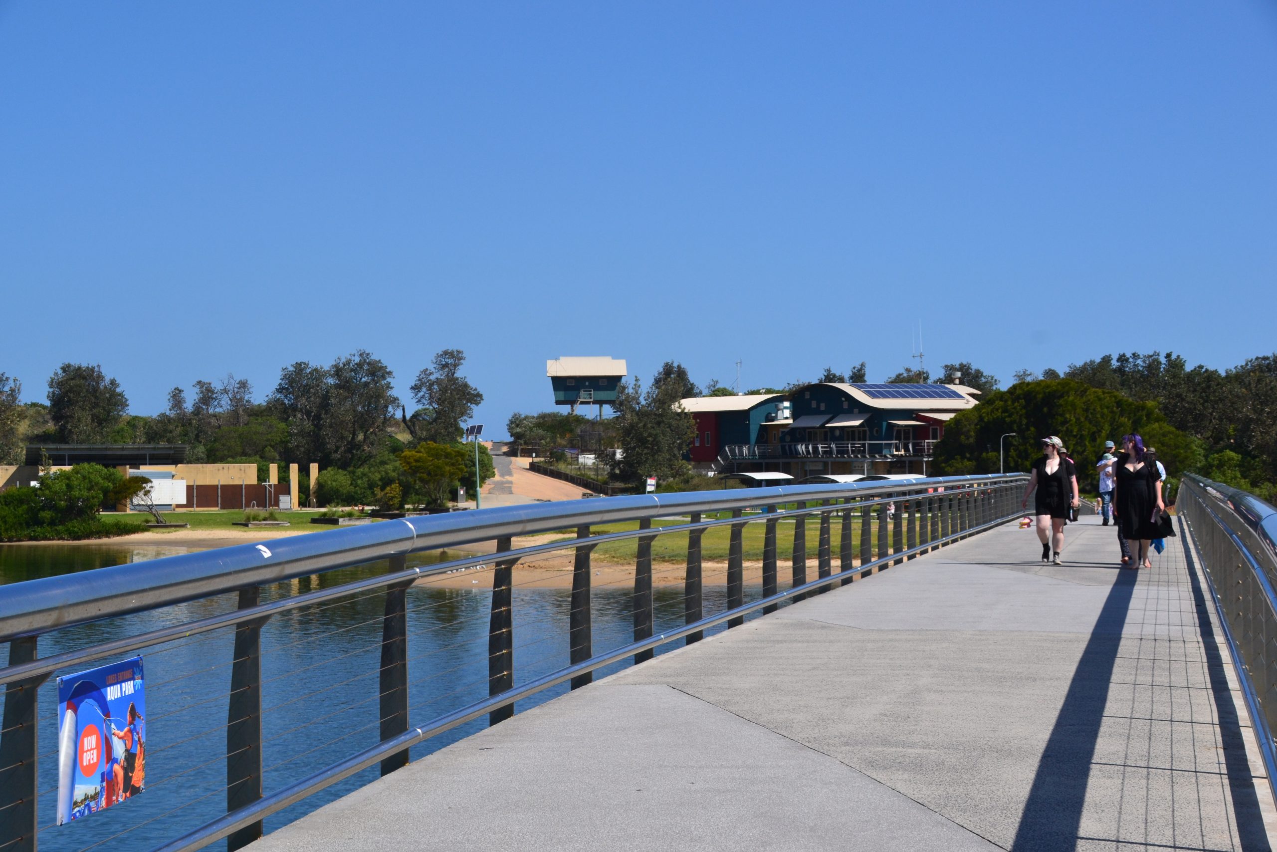 Diesmal machen ICBeter und Tami die Wanderung. Erst geht es voller Tücke über eine Brücke. Da kommt man auf den Lakes Entrance Beach. Der Wanderweg würde jetzt den Strand entlang gehen. Aber da muss man im tiefen Sand gehen. Dafür ist das gewählte Schuhwerk nicht passend. Da es ein Rundweg ist, kann man ihn auch von der anderen Seite gehen.