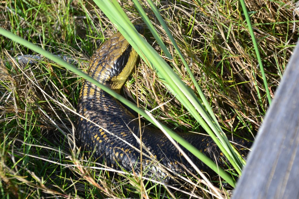 Haben wir natürlich nicht, weil wir von zwei schreienden Mädchen abgelenkt wurden. Da das Gras, in dem die Schlange angeblich ist, aber rund 15 cm unter dem Holzweg ist und Schlangen in der Regel nicht springen, gehen wir dort hin uns schauen. Es ist ein Lizard (Eidechse). Schlangen pflegen keine Beine zu haben. Wir versichern ihnen, dass sie der Lizard nicht umbringen wird.