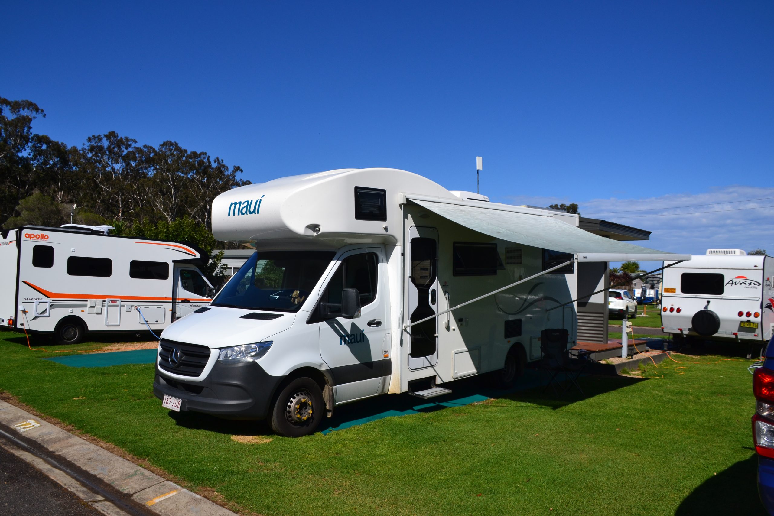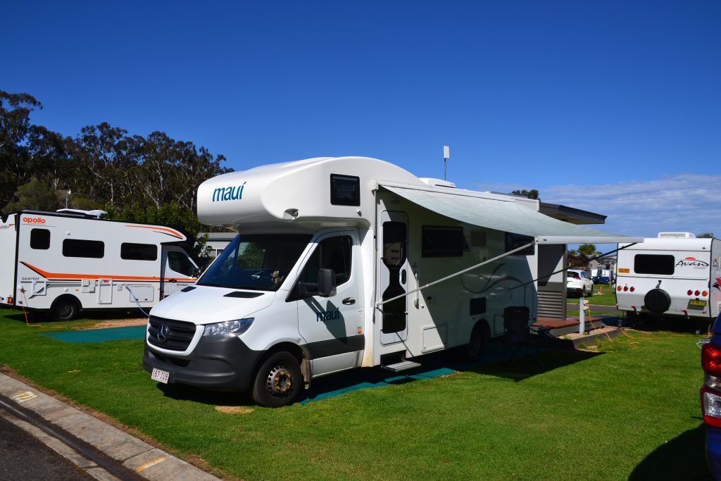 Aber sonst ist es den ganzen Tag sonnig und relativ warm. Gut, dass wir gestern alle aufgegessen haben. Durch de Ortschaft geht es wieder zurück zum Wohnmobil. Nächste Station ist der Campingplatz. Es ist der Lani’s Holiday Island in Forster.. Forster ist ein beliebter Touristenort, vor allem für Urlauber aus der Region Sydney.