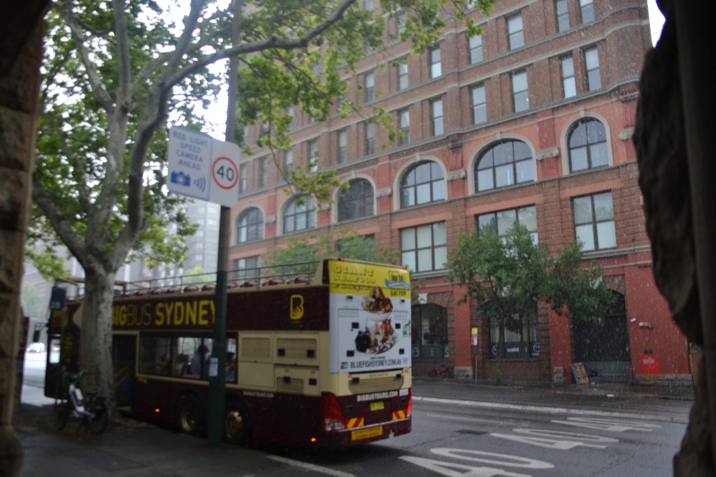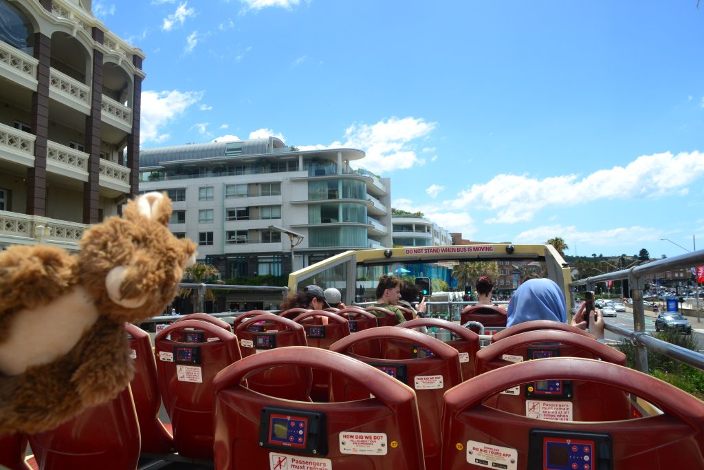 Mura gibt vorerst w. o. und Tami und ICBeter steigen unten ein, wo es noch Stehplätze gibt. Nach zwei Minuten Fahrt kommt wieder die Sonne raus. Heute muss unser Glückstag sein. Also wird nach oben gegangen, die gratis Regenponchos auf den Sitz gelegt und im Freien mitgefahren. Zum ersten Mal ausgestiegen wird bei Circular Quay.