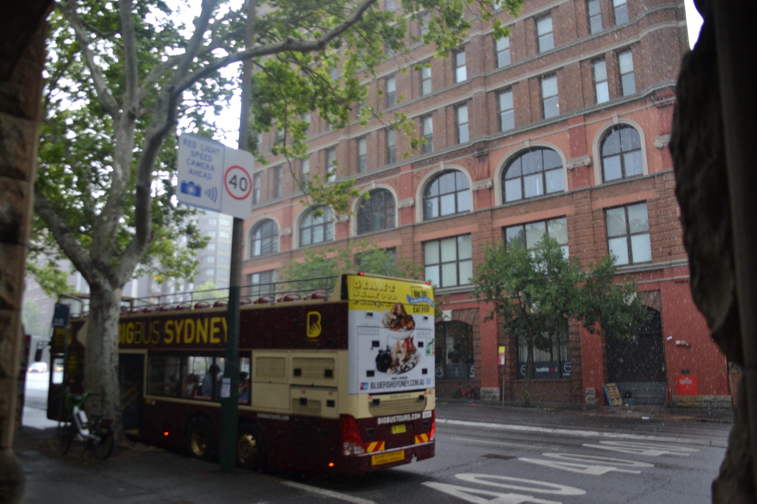 Dann geht es mit Uber zum Startpunkt des Hopon-Hopoff-Bus. Beim Aussteigen aus dem Auto beginnt es leicht zu regnen. Scheint nicht unser Glückstag zu sein. Dafür steht des Bus schon da. Glück gehabt. Die Ticket werden gekauft. Dann beginnt es wie aus Schaffeln zu schütten. Im Bus sind nur mehr die oberen Plätze verfügbar. Das ist bei einem Cabrio-Bus suboptimal.