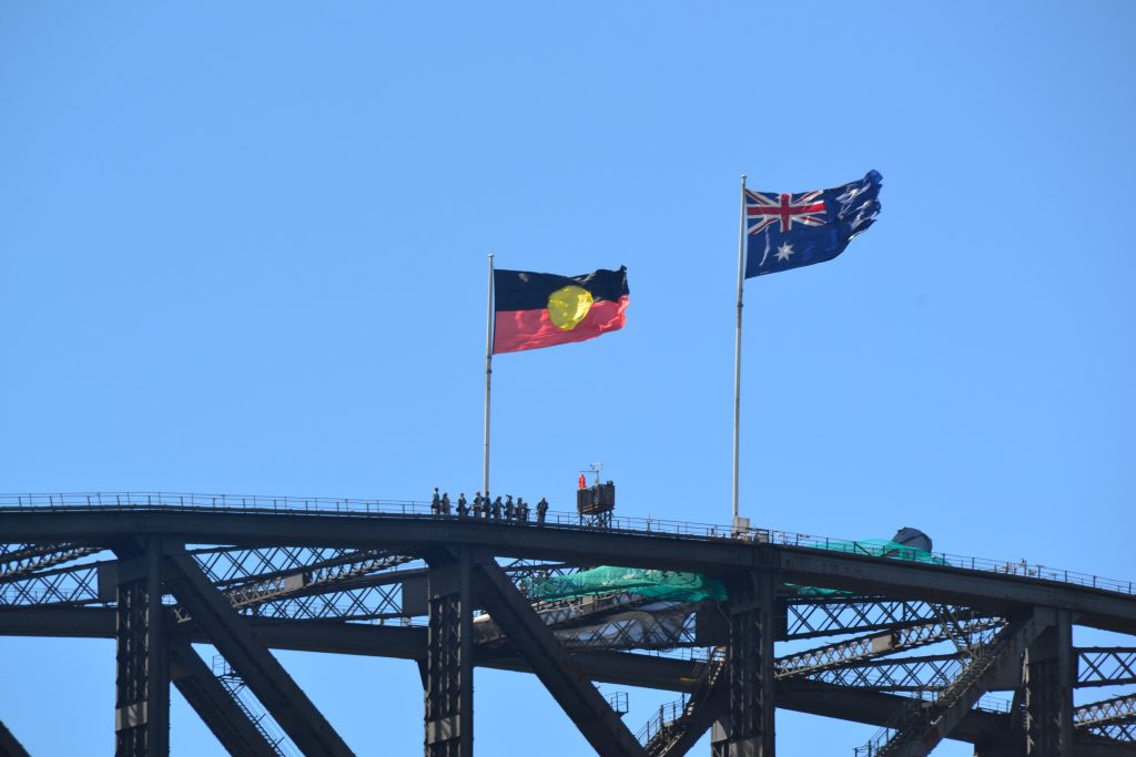 Da heute bekanntlicherweise der australische Hochzeitstag ist, sehen wir vor der Oper natürlich auch wieder Bräute mit ihrem Anhang. Fotografieren kann man die Oper von hier nicht sehr gut, dafür aber umso besser die Harbour Bridge. Dort ist gerade eine Gruppe ganz oben. Die Brücke kann man nämlich erklettern. Wenn man schwindelfrei ist und zu viel Zeit und Geld hat.