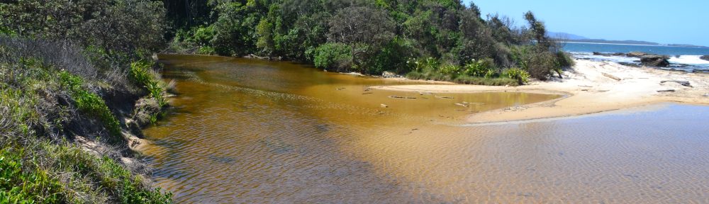 Dass wir immer weiter nördlich kommen, merkt man daran, dass die Vegetation anders ist, als bisher. Tiere sehen wir fast gar keine. Wo sind denn bloß die ganzen Kängurus? Am Ende des Weges gibt es aber einen Lookout am Sandstrand, wo der Bundageree Creek, ein kleiner Bach, ins Meer mündet. Das muss dringend fotografiert werden.