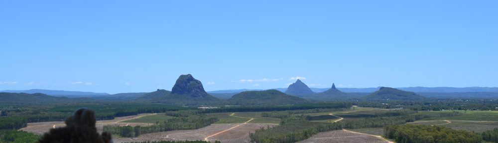 Der Vorteil, wenn man zur Mittagszeit wandert ist, dass man für Gesicht und Hals keine Sonnencreme braucht, wenn man einen breiten Hut aufhat. Denn der wirft seinen Schatten gerade nach unten. Wenn man sich gerade hinstellt, sieht man den Schatten des Hutes genau um die Füße herum. Man hat auch einen schönen Blick auf die berühmten Glass House Mountains.